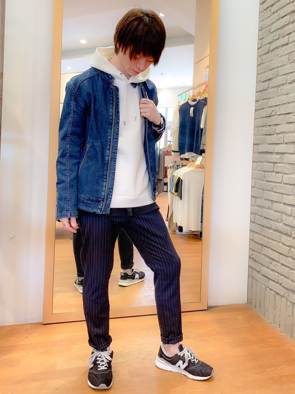 今日のコーデ。 以前も色違いで着用したパーカーにデニムライダースを組み合わせてみました。