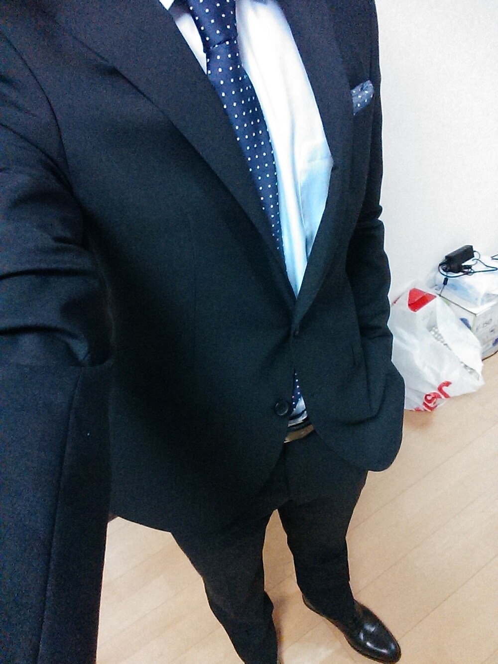 明日はとうとう入学式! 購入したスーツを着てみました( ̄▽ ̄) スーツを着た自分を見て なんというかもうおっさんだなぁと 思いました笑