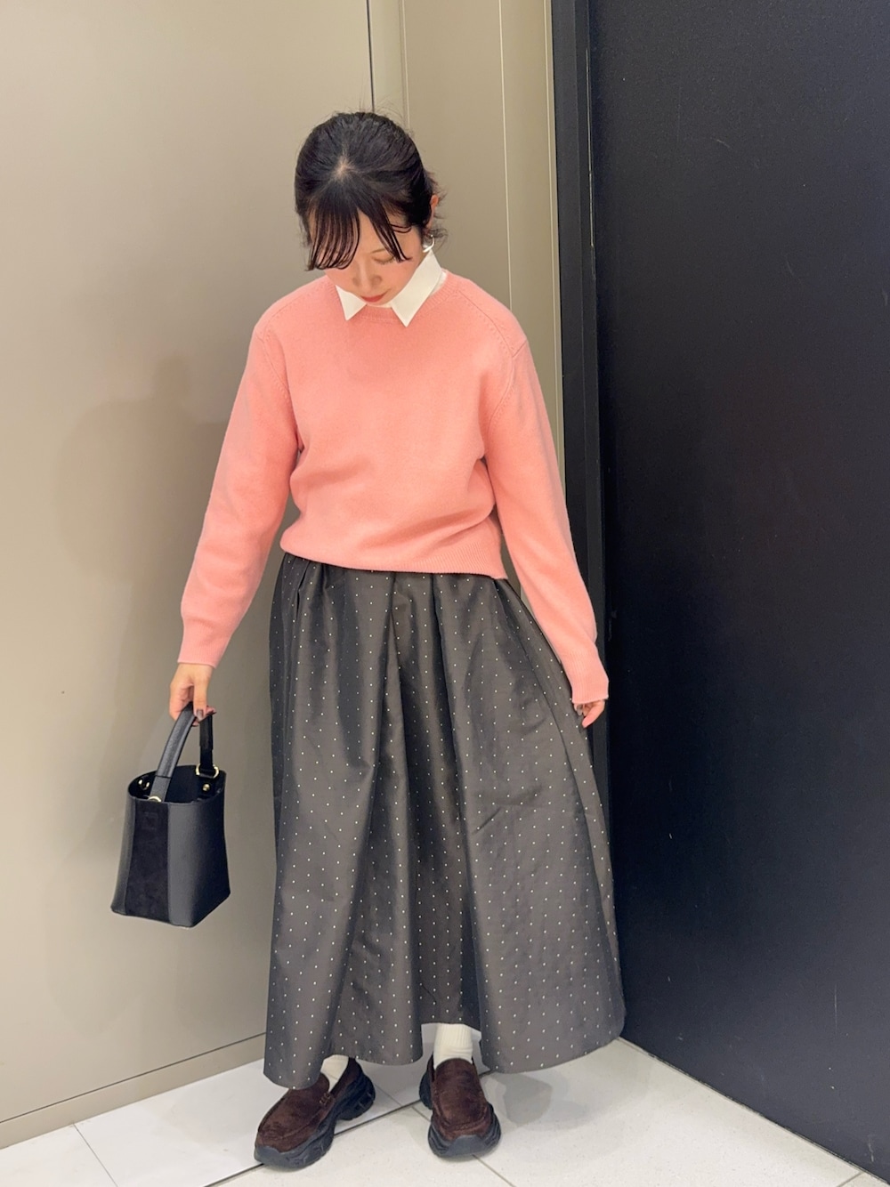 ピンクのニットがキュート♡ シャツを合わせる事でまとまり感を出してます! ドットスカートの光沢感が上品で高見えしますよ!