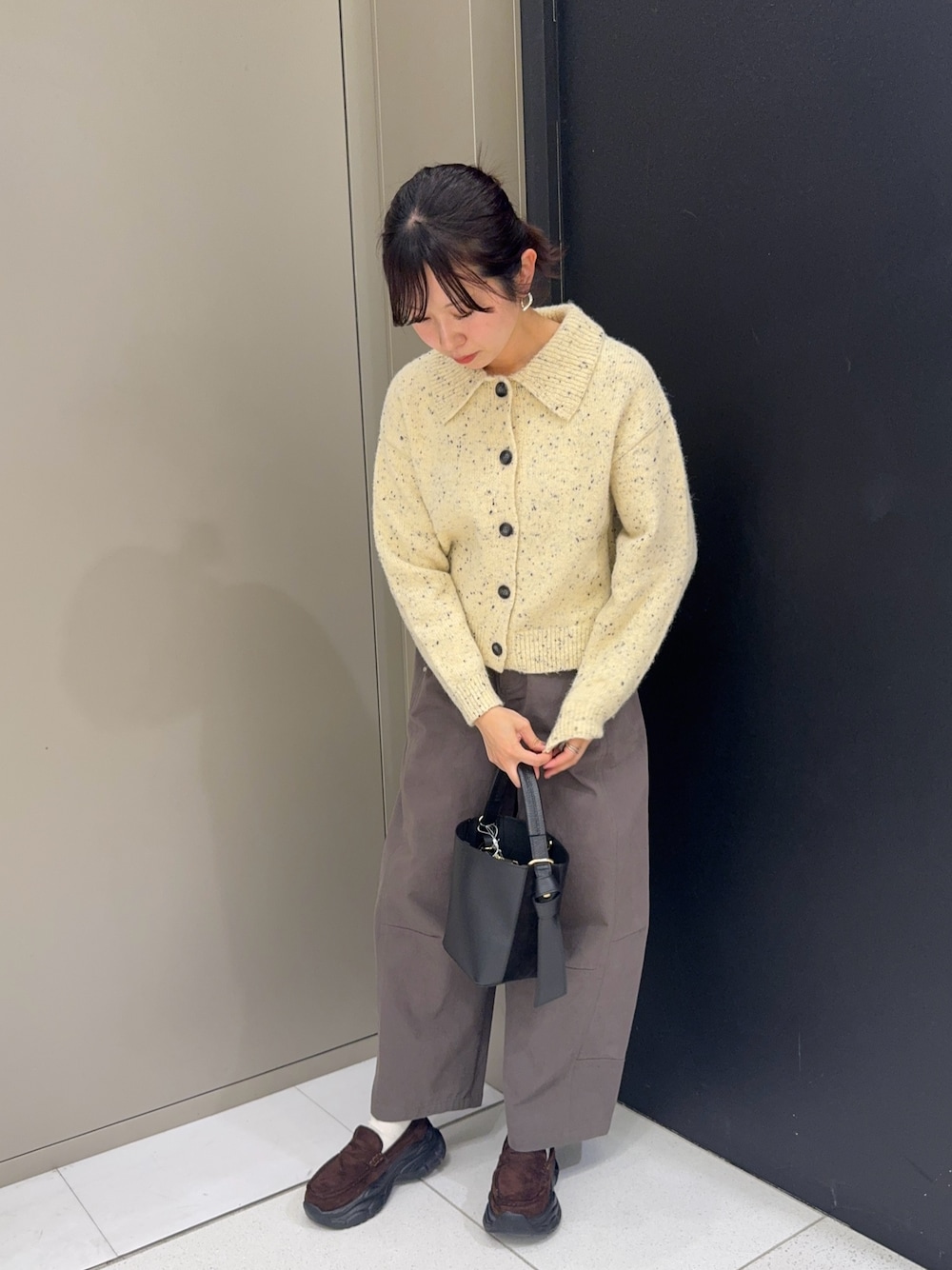 DOORSのニットカーディガン🧶 チョコチップみたいな柄がとってもかわいい! パンツ、スカート、ワンピース何にでも合わせられそうです✨ コクーンパンツは162センチの私には少し短めです!