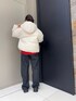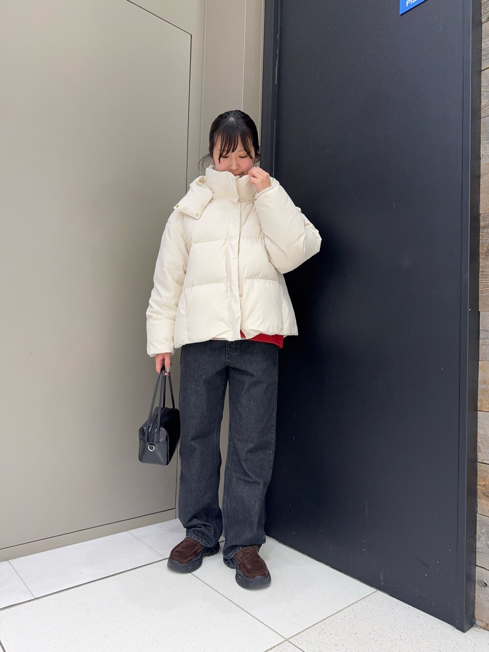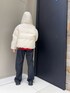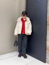白ダウンから少し見える赤ニットがポイントです🧶 ダウンジャケットは短めの丈なのでボトムスがしっかり見えます👀 暖かさ間違いなしの商品ですよ!
