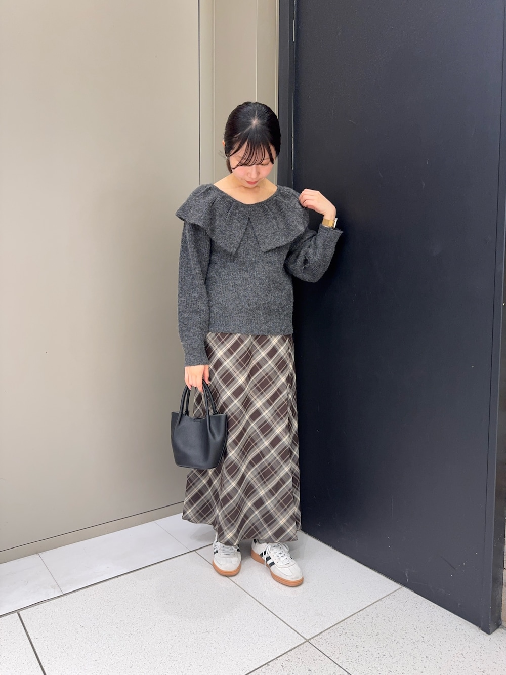 首周りが広く、大きな襟がポイントのニットです🩶 スカートでもパンツでも合わせやすく、どの組み合わせでも女性らしく可愛らしい印象になります!
