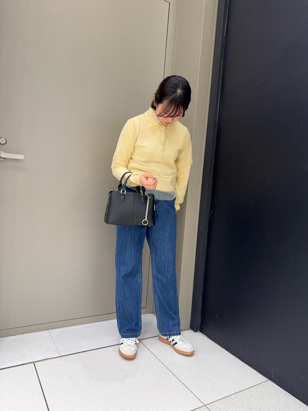 シャツ×デニム デニムのサイズはMサイズにしたので丈がぴったりです! 鞄はカジュアルにも綺麗めにも合わせやすいですよ!