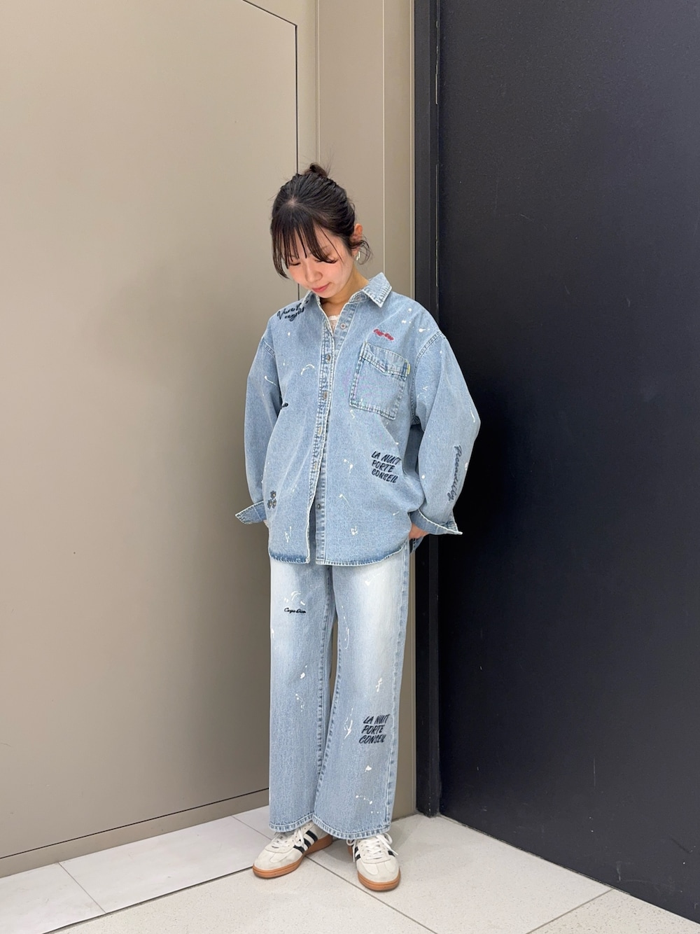 刺繍デニムシャツとパンツは手書き風の刺繍とペイントが唯一無二で惹かれるデザインが特徴です✨ セットアップでも単体でも使える商品です! パンツは36を着用しています!ぴったりサイズなので長い方が好きな方は38をおすすめします! 中にはレースを合わせています! レースを着ることで女性らしさも出せますよ!