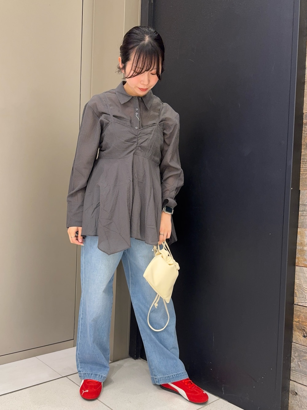 KBFのブラウスはブラウスとキャミソールで別々の着用も可能です! キャミソールの上にブラウスを着ることも可能になっており、1着で沢山楽しむことができますよ! かぐれのデニムパンツは生地が柔らかくとっても履きやすいです👖 ウエストはゴムになっているのでサイズ調整可能になっています! スニーカーを赤でワンポイントに✨ URBAN RESEARCH STORE ラゾーナ川崎店では、"かぐれ"POPUP SHOPを開催しております! 2/27(金)-3/29(日)までですので、ぜひお立ち寄りください😊