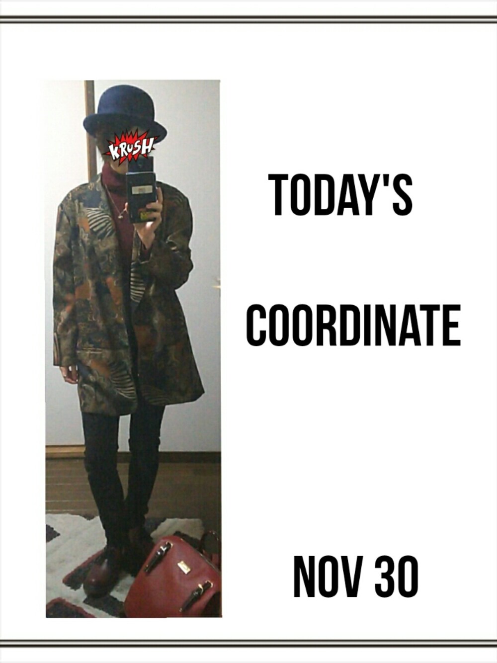 柄ジャケット✕ワインレッド ボーラーハット ジャケット ハイネックニット スキニーデニム 3ホールブーツ 久々のお出かけ。 母と買物へ。 好きな服来てお出かけはよい\(`Θ◊Θ´)/ この、ジャケットはお気に入り。 虎柄やらペイズリーやらが どどーんと。 ペラペラの生地オンリーだけど 雰囲気に一目惚れの、衝動買い。 インパクトのある服を探しております。