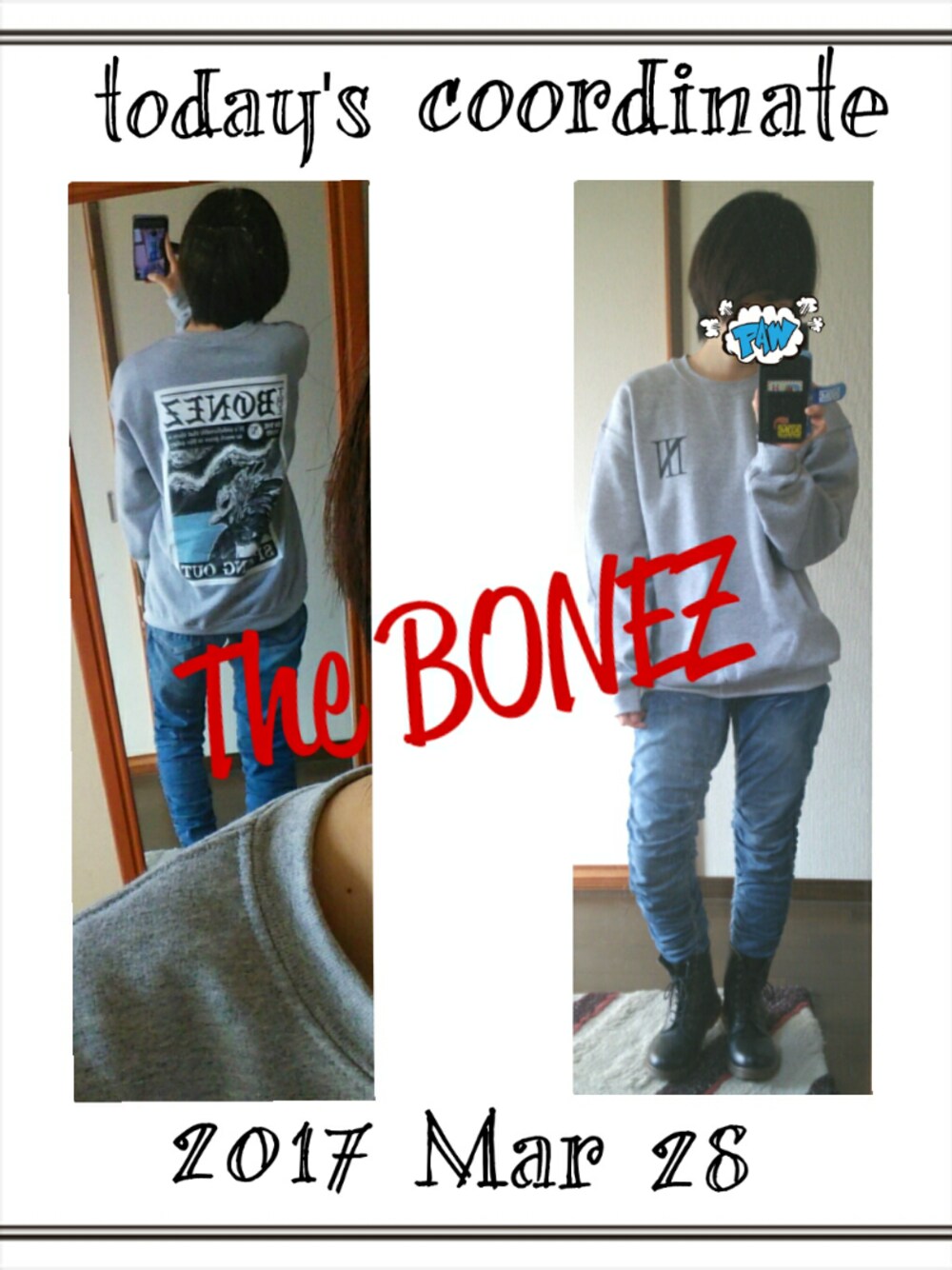 ライブグッズ✕日常 スエットパーカー ジーンズ ブーツ どこに行くわけでもなし。 手抜き…です。すみません。 ライブグッズを平気で日常に取り入れる。 TheBONEZのライブはもちろん、 グッズも申し分なし。 人間性に惚れるわ。 外出する宛があればこれに ハットかキャスケットを被ろう。