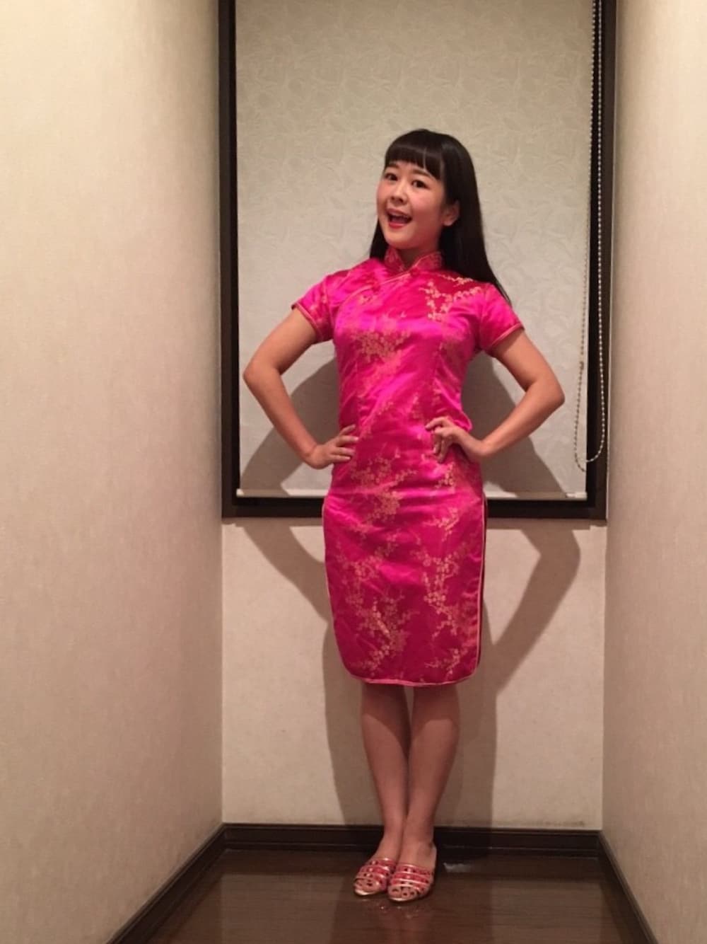 ピンク系のドレスを着用したレディースの秋コーディネートの1枚目の写真