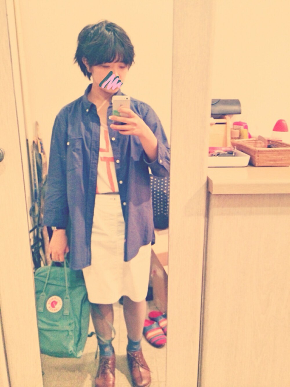 白タイトスカート と 灰色タイツ と カンケンバッグ 茶色の革靴はお母さんと兼用笑
