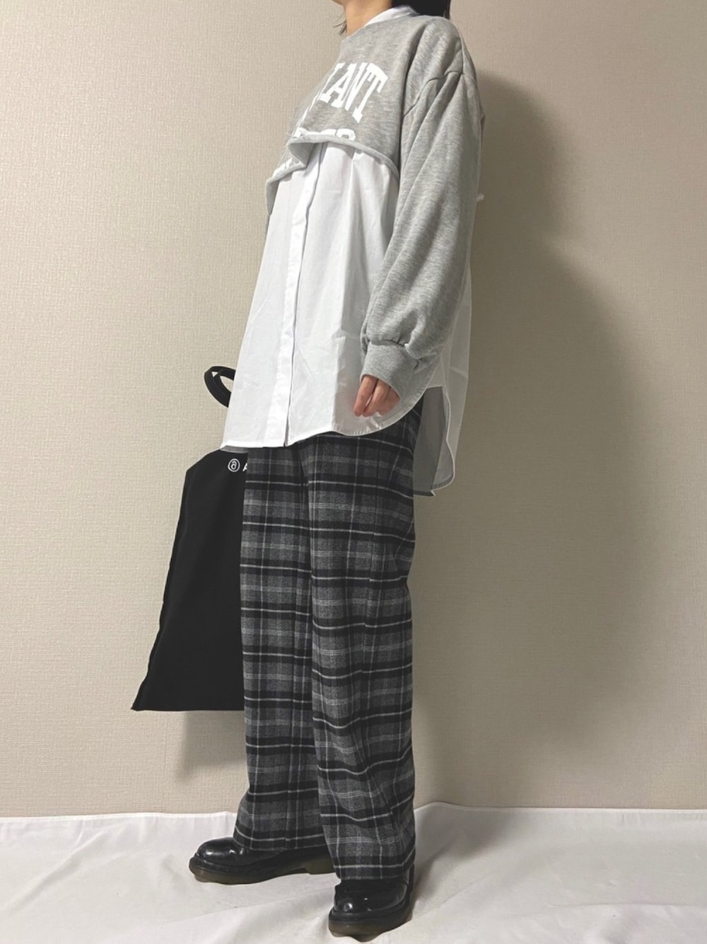 GUのセールで590円になってたチェックパンツは、楽ちんなのでよく履いてます。(私はプロパーで買ったけど…😭笑) スエットはトレンドのカレッジデザインをスーパーショート丈にしたちょっと癖ありアイテムですが、シャツと合わせるとバランスよく合わせられる気がします🙆♀️