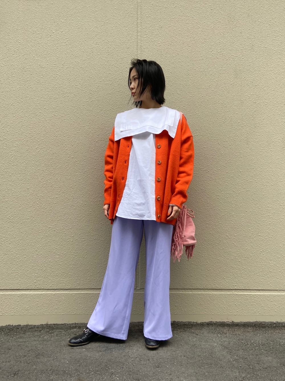 いつもいいねやお気に入りありがとうございます🙇♀ 春カラーのワイドパンツに、オレンジ色のカーディガンで花束みたいなカラーコーデに💐 ワイドスラックスは落ち感が綺麗なので、足元も綺麗めなローファーで合わせました🙆🏻♀️
