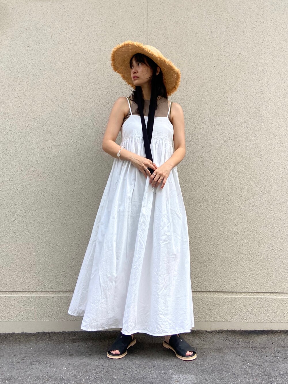 白のキャミワンピに麦わら帽子で夏コーデ! 見た目も涼しいけど、麦わら帽子で本当に体感温度下がります👒