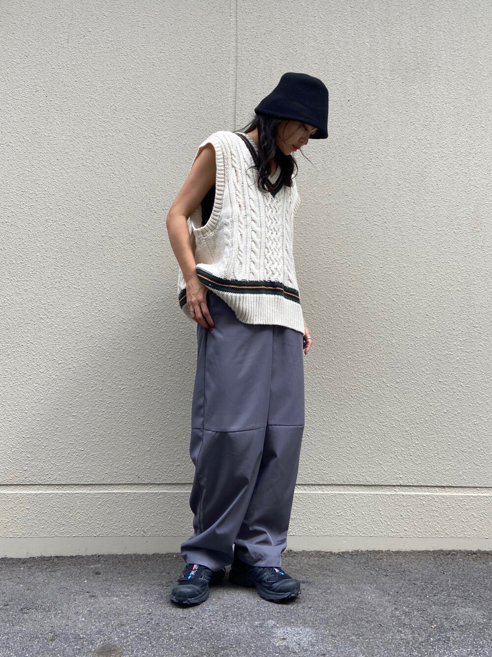いつもいいねやお気に入りありがとうございます🙇♀ まだまだ暑くて、でも秋っぽくしたくてニットベストを! カーブパンツスラックス、シワになりにくいし楽だし、良い感じです🙆🏻♀️