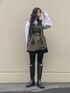 いつもいいねやお気に入りありがとうございます🙇♀ 雨の日のブーツコーデ。 着圧レギンスで細見え、さらに新作のミリタリーベストがウエスト位置を上げてくれてめっちゃ脚長効果!!