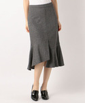 アシンメトリーなヘムラインが遊び心のあるスカート。 マーメイドシルエットのミモレ丈で女性らしい印象に。 ネイビーのニットにチェック柄ストールを羽織って、大人っぽくまとめた上品コーデ。