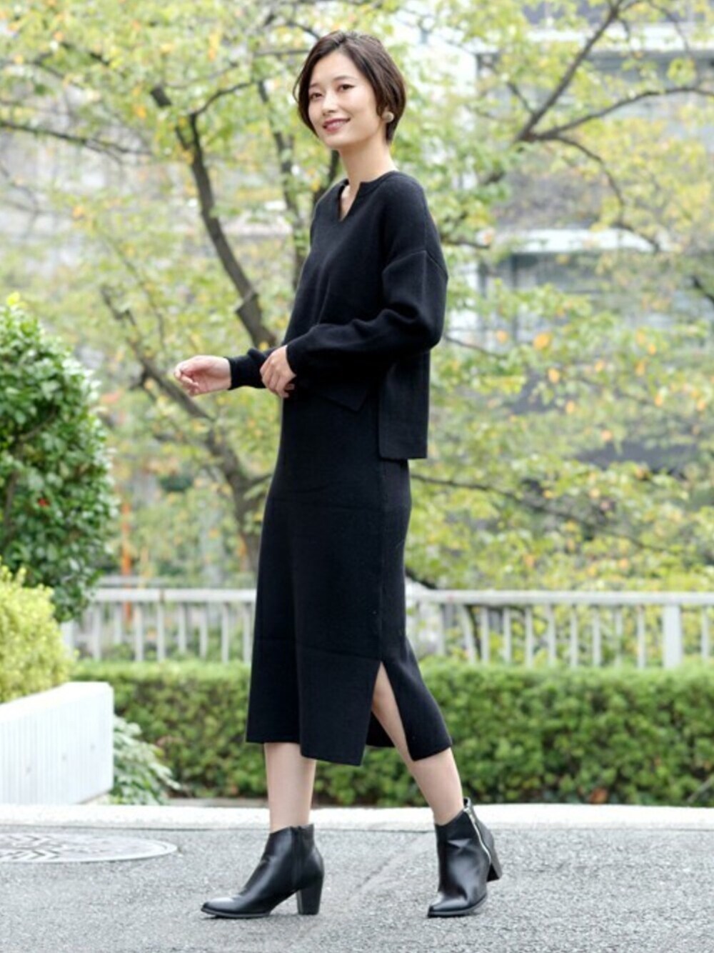 総針ニットとスカートはセットアップで着こなせるアイテム♪ どちらもベーシックでシンプルなので幅広くスタイリングに使えそうです。今年らしいキーネックデザインが大人可愛い♪