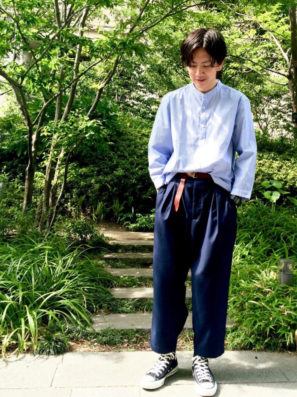 きれいなストライプのシャツです!!🏄🏄 しかも僕の好きなバンドカラー✨✨ あえて大きめサイズを着てます!! それでも野暮ったくならないのでオススメです👍👍👍 そんなシャツもMAEDAKE-IN 🕴🕴