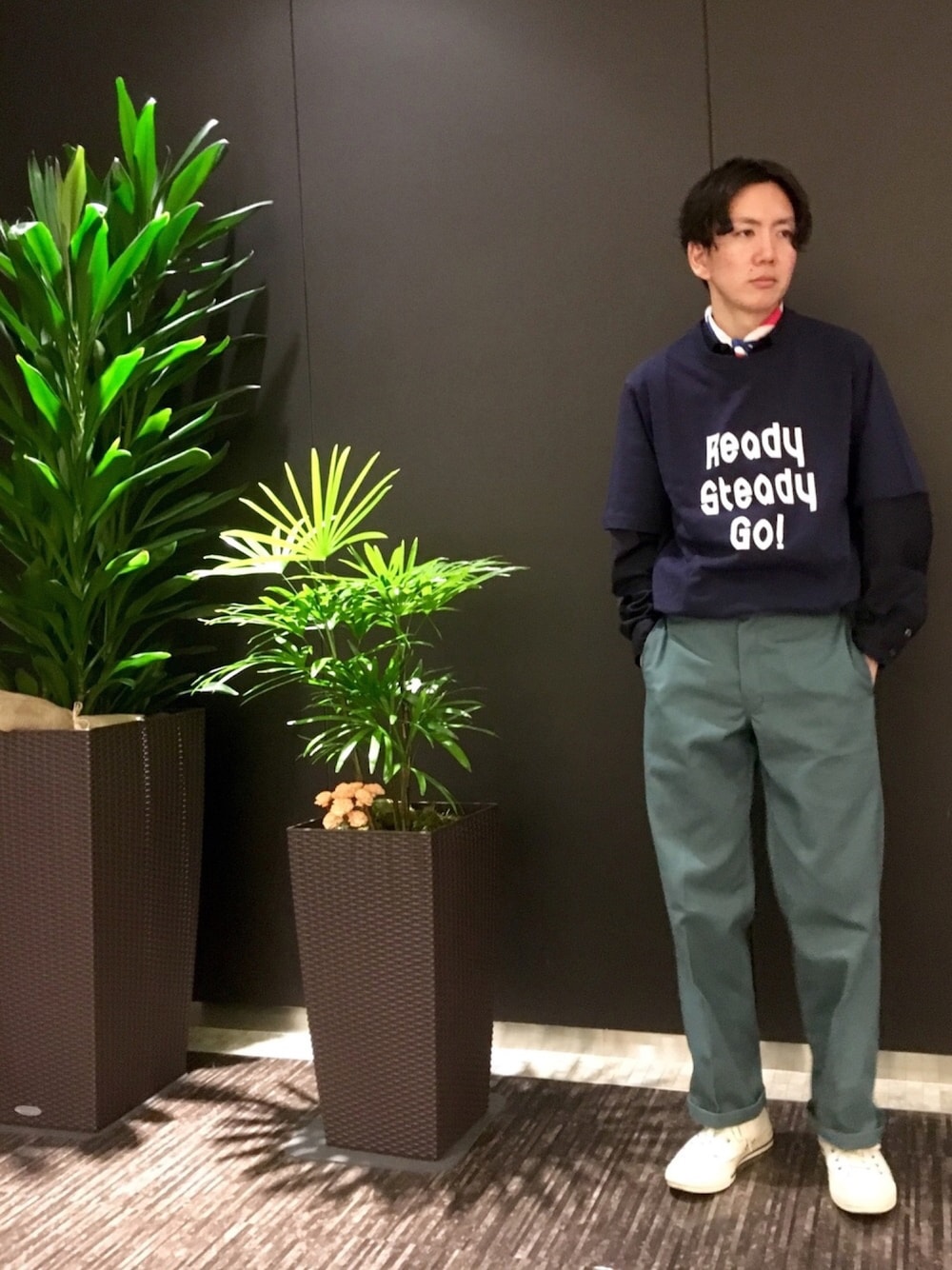 Ready Steady Go!とのコラボアイテムの一つであるスカーフを首に巻きました!! きれいな色がダークトーンのトップスの中で良いアクセントになっています✨✨ しかもTシャツも着ちゃいました!! 半袖だけではまだ寒すぎるので中に長袖シャツ着てます!! これで今からでもReady Steady Go!を存分に楽しむことができます!!🎉🎉 どれも本当にかっこいいのでぜひ実物を見に来てくださーい🕴🕴🕴