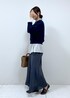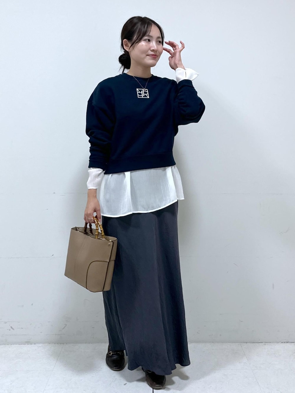 ゆる可愛いコーディネートには ゆったりサイズのスウェットがおすすめです! ネイビーのスウェットとグレーのスカートを 合わせる事でラフすぎずきちんと感がプラスされ 甘すぎない大人可愛いカジュアルコーデに。 白のブラウスをレイヤードする事で暗くなりすぎず メリハリのあるコーデにしてみました!