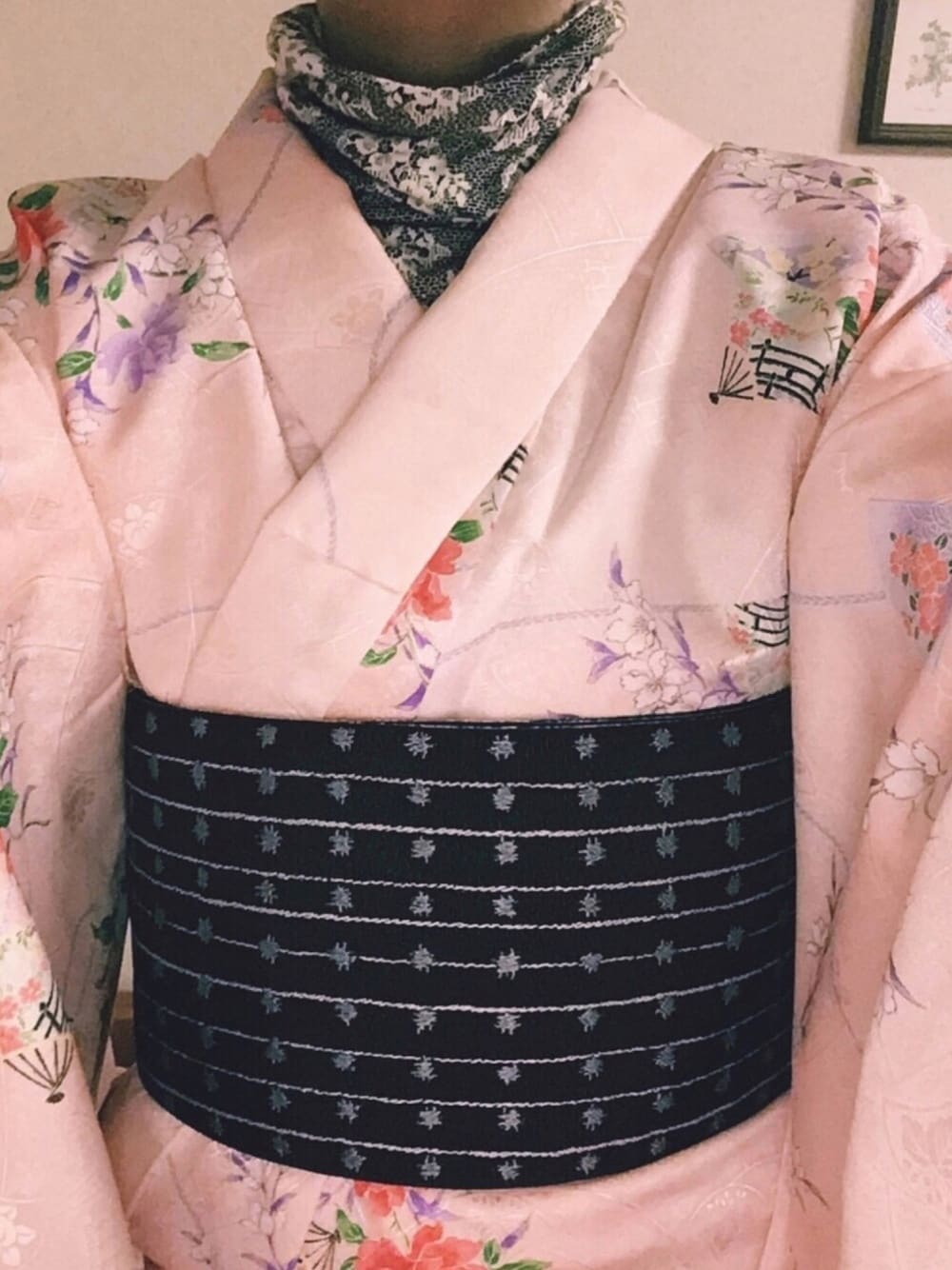 洋服では絶対に選ばないパステルピンクの着物。 こちらは、楽天のリサイクルショップで洗える素材の未使用品をお安く購入できました。 地紋入りの生地に、薔薇と扇の文様が散りばめられた縁起の良い上品な柄なので、帯をもっと豪華にすればフォーマルにも対応できそうです。 それでもカジュアルな合わせ方でしか着ませんけれどね〜 結晶柄の刺繍が施された半幅帯は、シルバーグレー地とのリバーシブルで素材はポリエステルなので、こちらも洗えるのが嬉しいです。10年位前に閉店セールか何かで手に入れました。 襦袢代わりのインナーははもっと古く、親が買ってくれてから20年は経っていて自分でもビックリ😅 当時ではかなり珍しいデザインで、レース模様が全面プリントされた綿のカットソーなのですが、タートル部分と両袖部分がギャザーになっているんです。 一枚で着ても様になるアイテムなので、着物の袖から見せたら可愛いと思い合わせてみました。 まだ寒さの残る時期の春コーデです!