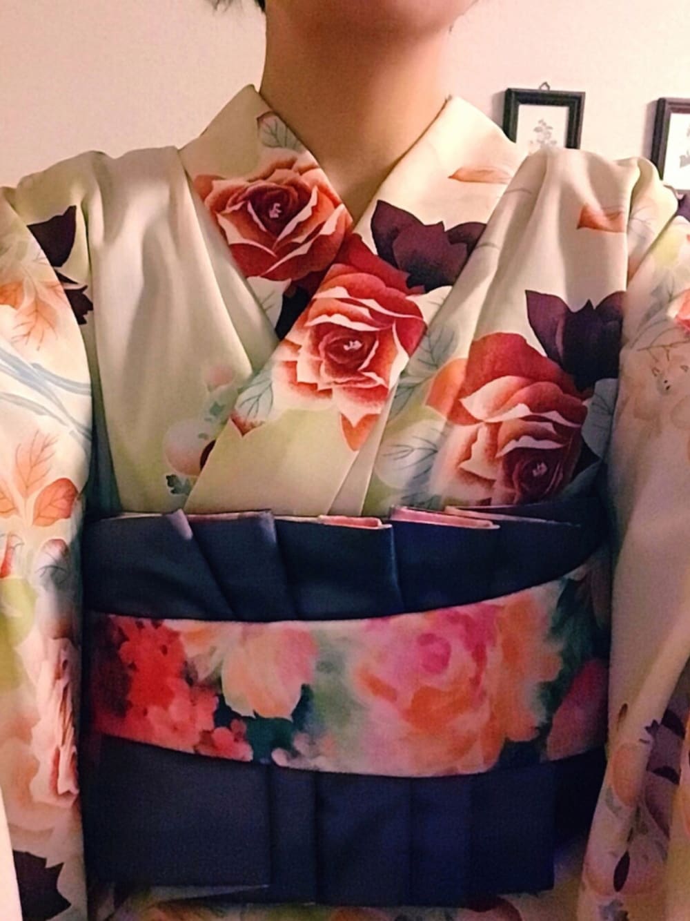 お気に入りの撫松庵の着物兼浴衣。 フリマアプリで購入した、美しい薔薇柄のリバーシブル半幅帯を合わせて。 洋服ではまずしない(出来ない)花柄コーディネートですが、着物なら躊躇なくできるのが嬉しい。 帯結ばない帯結びはうさこまさんの動画を見て練習し、今では自分なりに少しアレンジも出来るまでになりました。