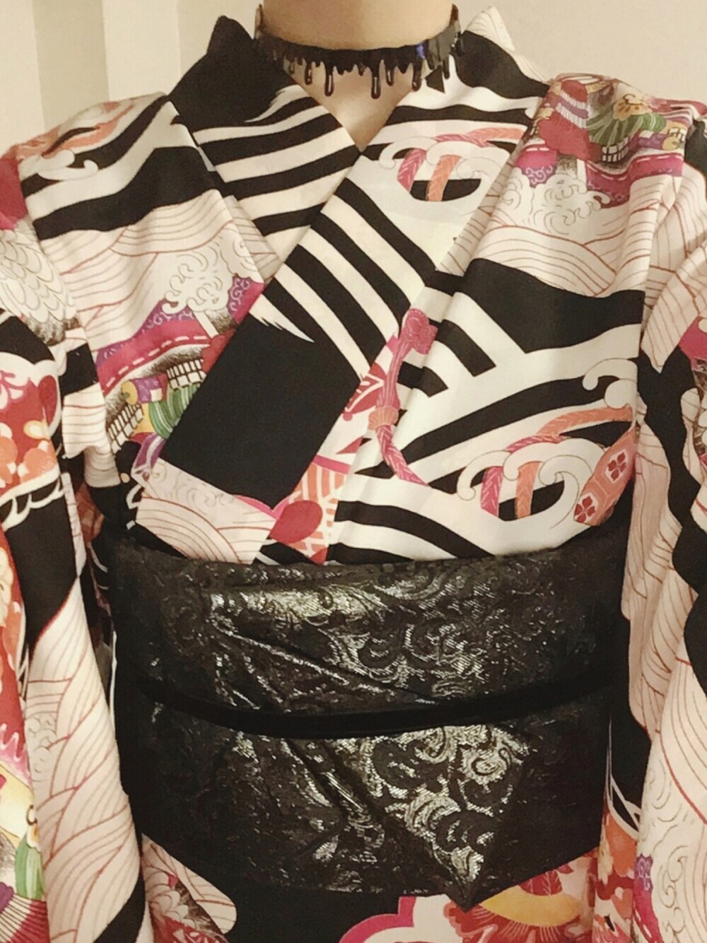 撫松庵の着物兼浴衣とTSUBAKIANの黒×ゴールドのゴージャスな兵児帯を合わせて。 帯結ばない帯結びで、ベロアリボンで帯締めの代わりに巻いてみました。 Q-pot.のメルティチョーカーをつけると、大正ロマンな宝船柄の着物はゴシックテイストにも合うのだなぁと新しい発見が。 これだから、着物は楽しいのですね。
