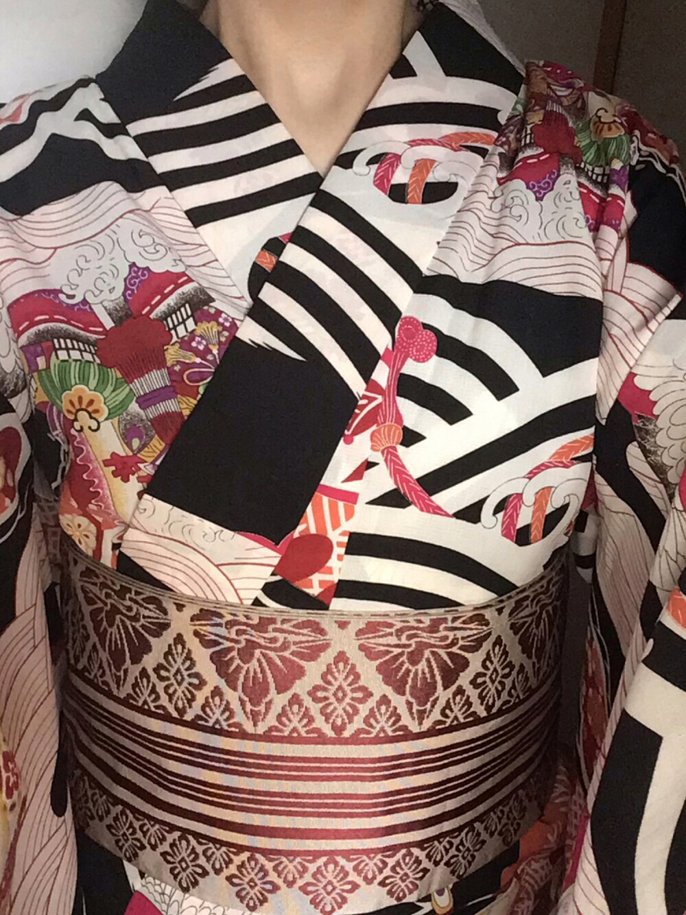 おめでたい宝船が描かれた着物兼浴衣に、向かい鶴が織られた献上柄の帯を合わせて。 この柄行きはお祝いごとにふさわしいので、中に襦袢を着て着物として着ると、喜ばれる場面が沢山あります。 季節は逆ですがお正月にも向いているくらいなので、歳を重ねてもずっと着ていこうと思います。 大事にしよう。