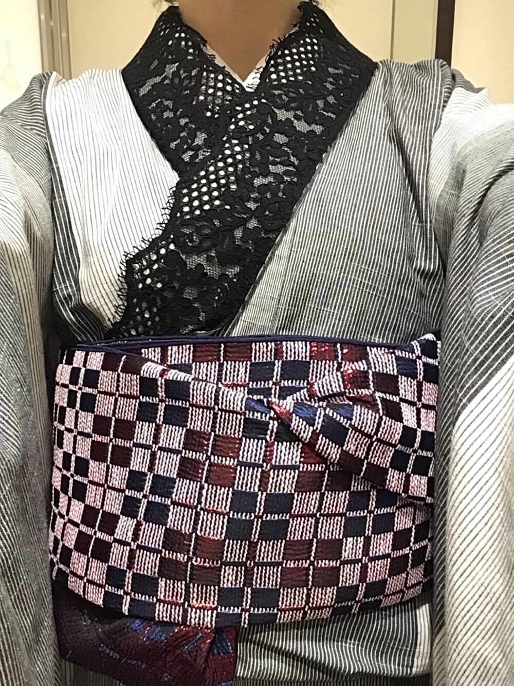 伊勢木綿の着物に、TSUBAKIANのレースのかけ衿とラメ織が特徴の兵児帯を合わせて。 帯締めも帯揚げもしたくなかったのですが、しっかりと帯を締めるには…と考えて、うさこまさんのコルセット風結びをアレンジして、前で片挟み風にしたら、後ろ姿も正面も特徴のある着姿になりました。 普段着物に少しデコラティブなアイテムを合わせるのは、洋服のコーディネートでも通じるので、私はとても好きです。