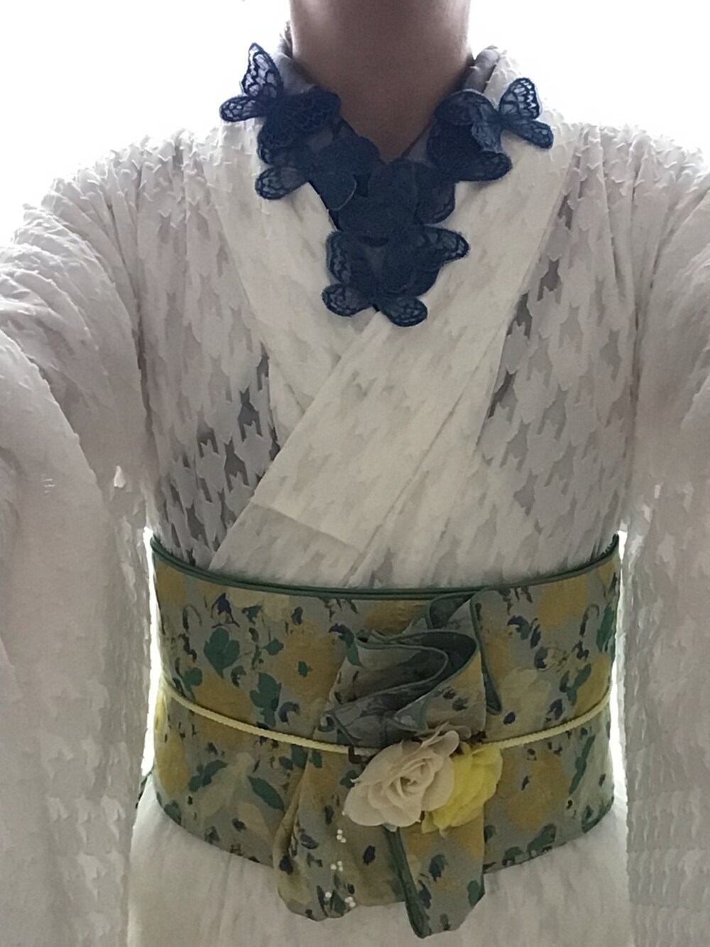 半衿が主役の、夏着物のコーディネート。 襦袢を着物と同じ白にして、半衿を濃い青色のオーガンジー生地のものにしたので、敢えて薄らと透けて見えるようにしました。 帯に半衿とかなり近い青色が散りばめられているので、関連性を持たせたかったのです。 とても暑い日でしたが、身八つ口から通り抜ける風が気持ち良かった。