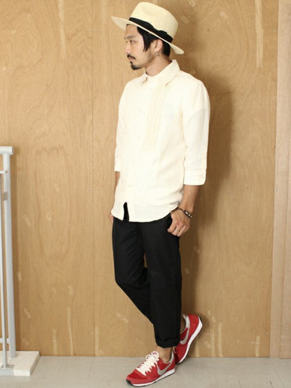 7分袖のシャツをメインにコーディネート。 形がとてもきれいなので、9分丈のパンツを合わせてスッキリとまとめました。 ハットも合わせたので足元はスニーカーで外しつつ、赤で差し色。 パンツはシルクを使っているのでとても気持ちのいい肌触りです。