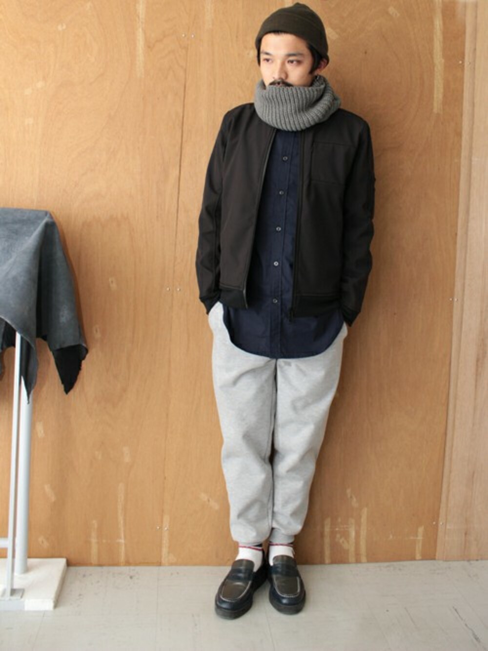 ミリタリーアウターのMA-1を着崩したコーディネートです。 スウェットパンツは3層の生地で作られている様で、型崩れしにくく、しっかりした履き心地です。 MA-1は毎年人気のアイテムなので、1着は持っていたいですね。