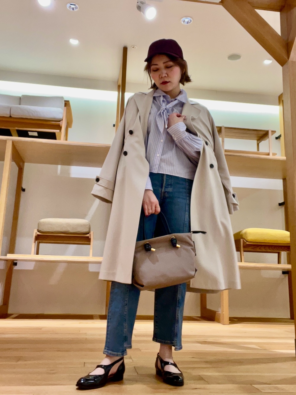 人気のトレンチコートは36のサイズでスッキリと着用しました‼︎ 着丈の違いがメインになるのでお好みな着丈・シルエットを選んで頂けます‼︎ シャツは、スカーフがセットでスカーフは、タイ風に合わせポイントにしました‼︎ 着丈もショート丈ですが短過ぎないのでローライズのボトムも合わせて頂けます‼︎ デニムは、裾がランダムな長さでお洒落に!