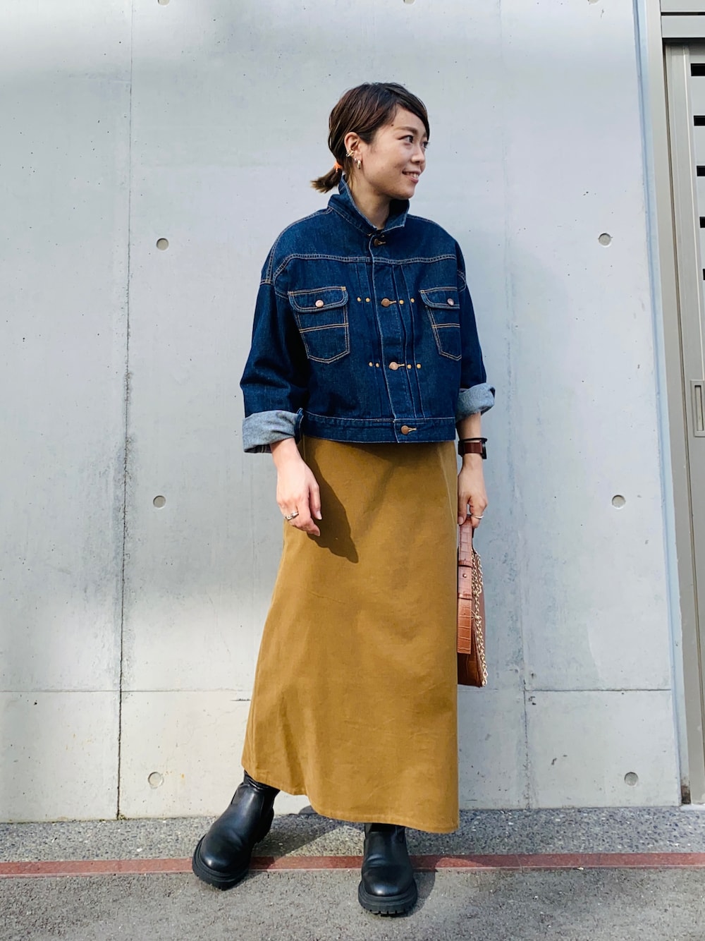 季節感たっぷりのコーデュロイジャンパースカートに、ショート丈のデニムジャケットを合わせました。 ジャケットの襟を立てる所がポイントです。