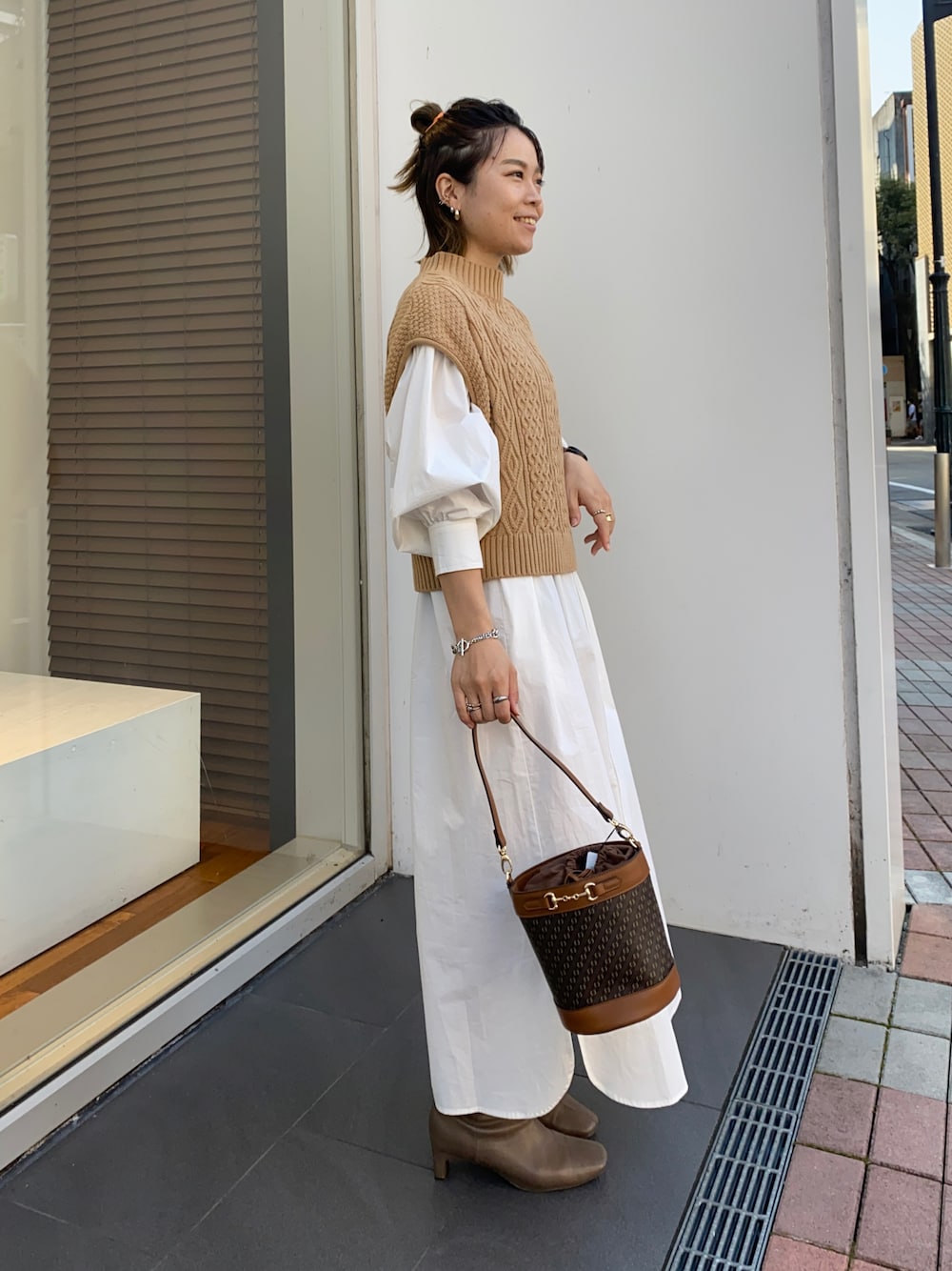 お鶴のワンピース「ニットベスト付きシャツワンピース」を使ったコーディネート