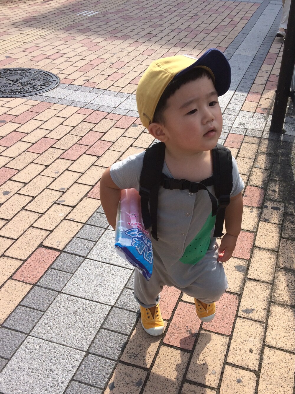 チューペットは俺のモノ‼︎と言わんばかりに、小脇に挟んで重たいのに一生懸命持ってますコーデ♡←長っw リュックは毎日絶対背負ってます♡ 帽子も必ずかぶります♡ はい、ぼくカンタです♡← 帽子★マーキーズ ロンパース★bobo choses シューズ★Cienta リュック★Lee 目線の先は、、バスですw