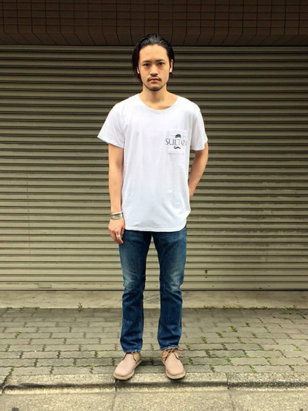 nonnative-SULTAN TEE nonnative-DWELLER 5P JEANS COTTON 12oz DENIM VW DARK nonnative-PILGRIM CHUKKA BOOTS COW LEATHER by CAMILLE TANOH