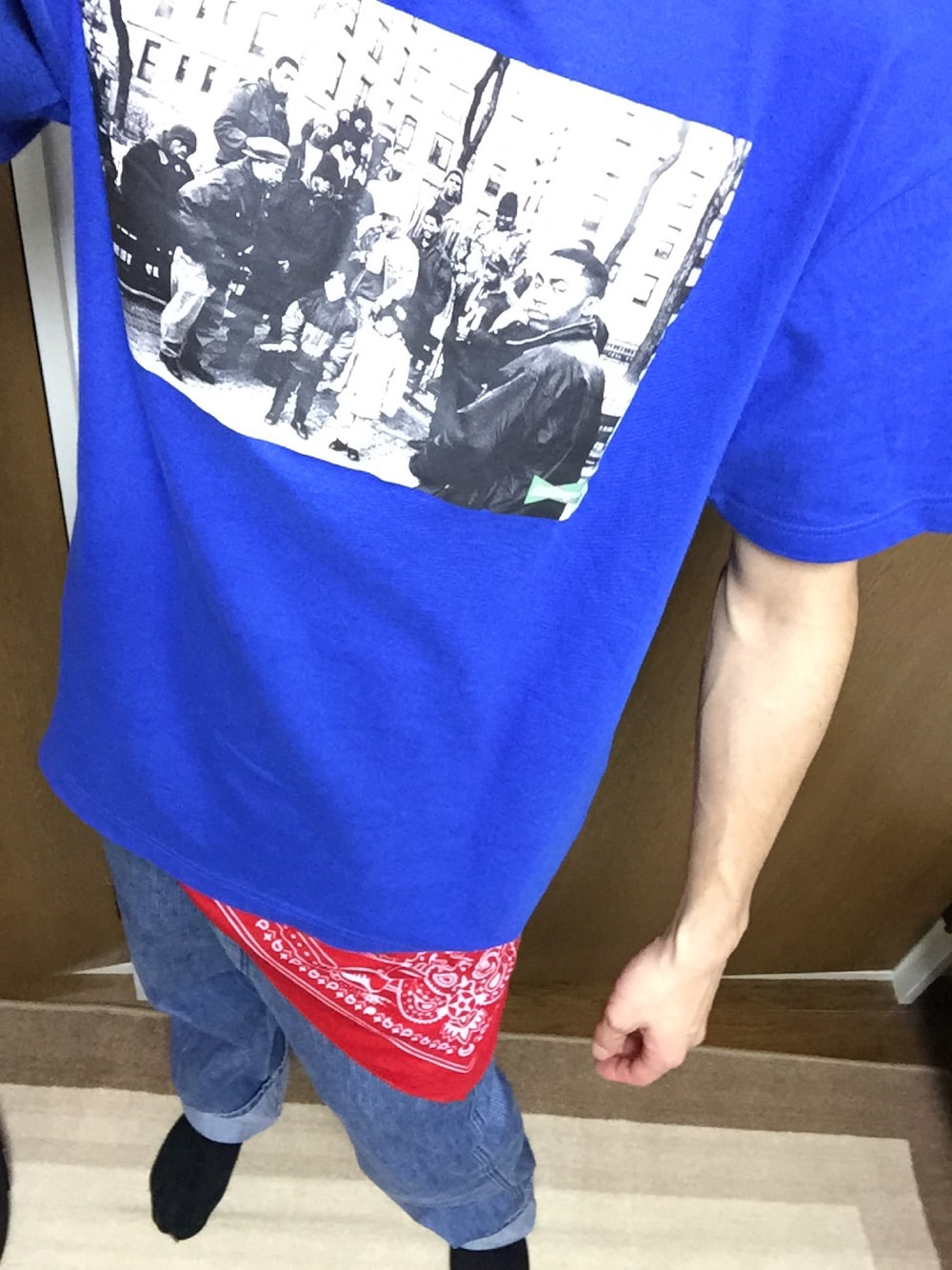 ブルー系のTシャツ/カットソー、ブルー系のデニムパンツを着用したメンズの夏コーディネートの1枚目の写真