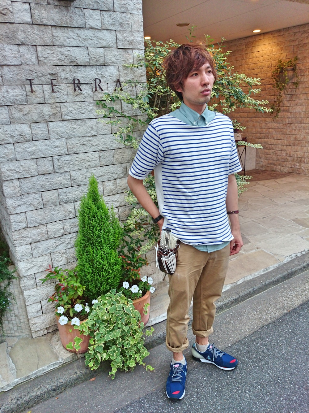 トップスはuniform experiment。ボーダーの色に合わせて、靴はルコックのエウレカのミタスニーカー別注モデルにしてみました。