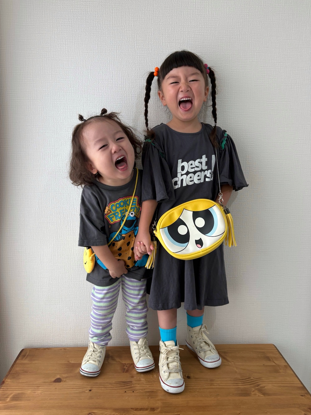 ブラックのお洋服にイエローのバッグを合わせたリンク風コーデ💛 色を揃えるだけでおそろい感が出てかわいい☺︎