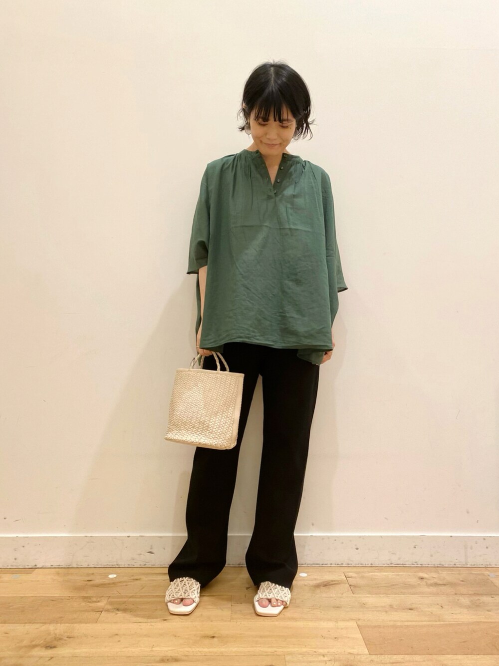 鮮やかなグリーンのブラウスがポイントです◎