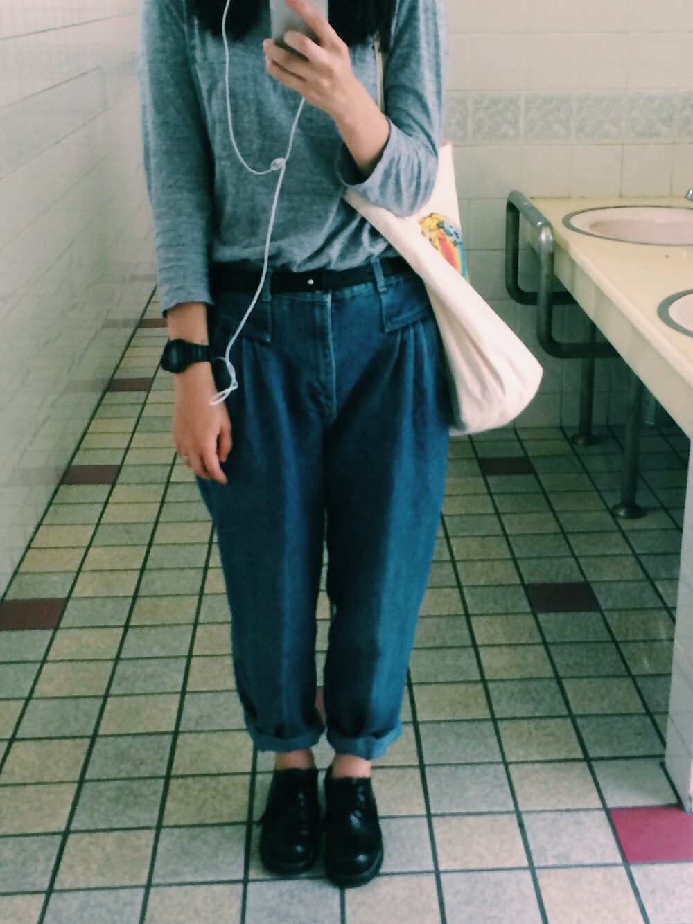 ポケットT...MUJILABO ジーンズ...ヘミングショップの古着 ベルトとエコバック...cosmic wonder 靴...古着