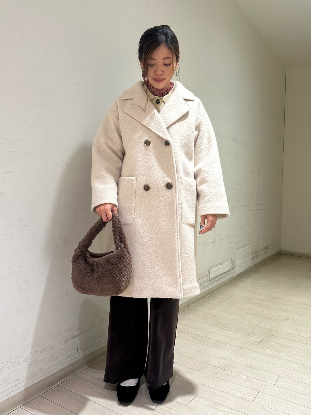 チェスターコートはブークレ生地が可愛く、近くで見ると生地がキラキラしていて高級感があります✨