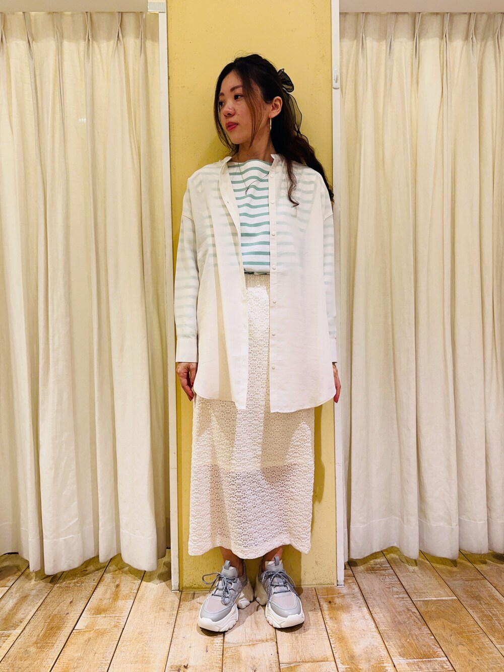 ボーダーのプルオーバーは春らしいお色で、キレイめにもカジュアルにも良くあいます🌸 スカートは、ストレッチがよく効いていてタイトなのにとても動きやすいです🍀