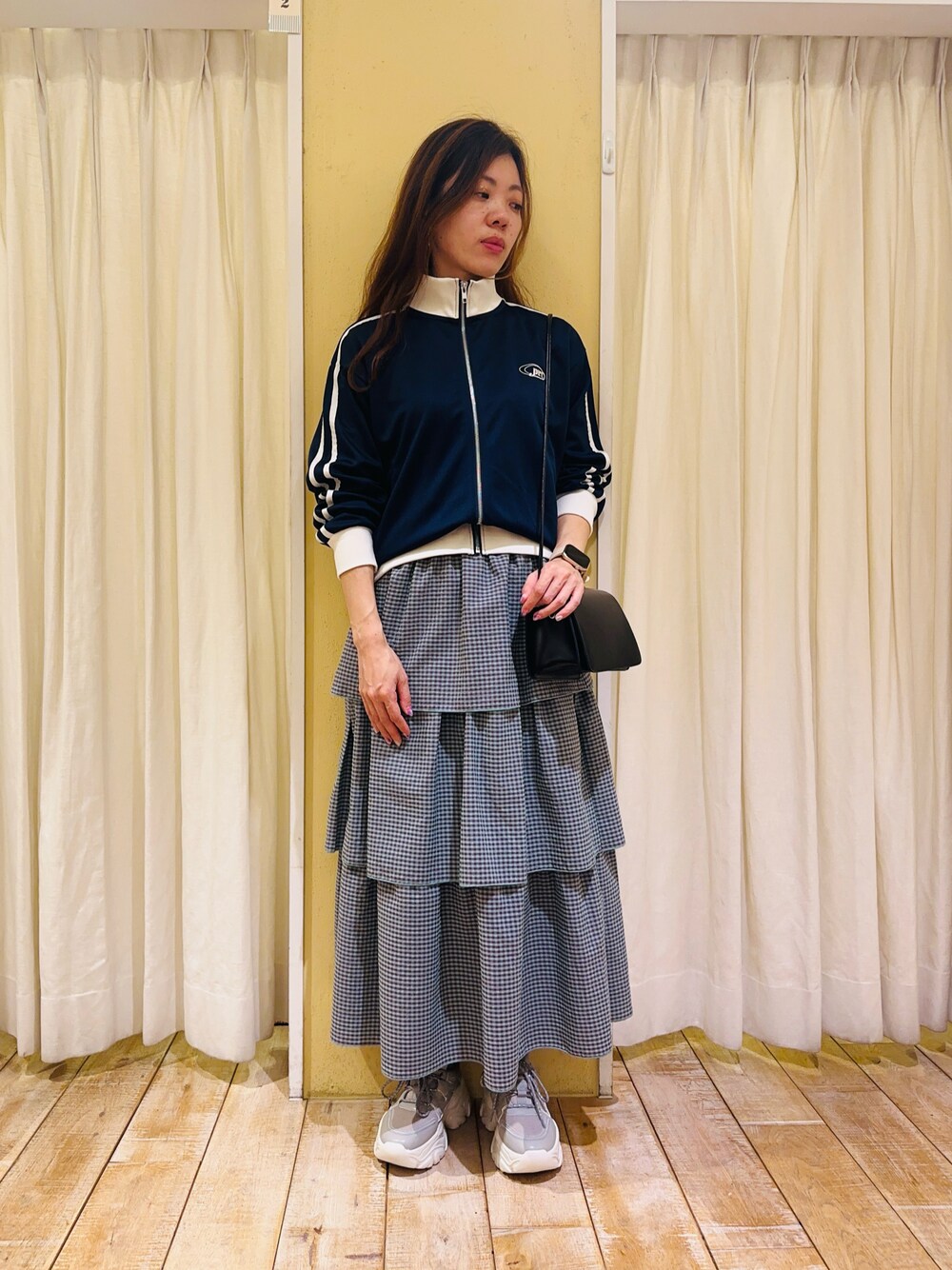 トラックジャケットはスポーティーな印象ですが、甘めなティアードスカートと合わせることでジャージっぽくなく着ていただけます🍀