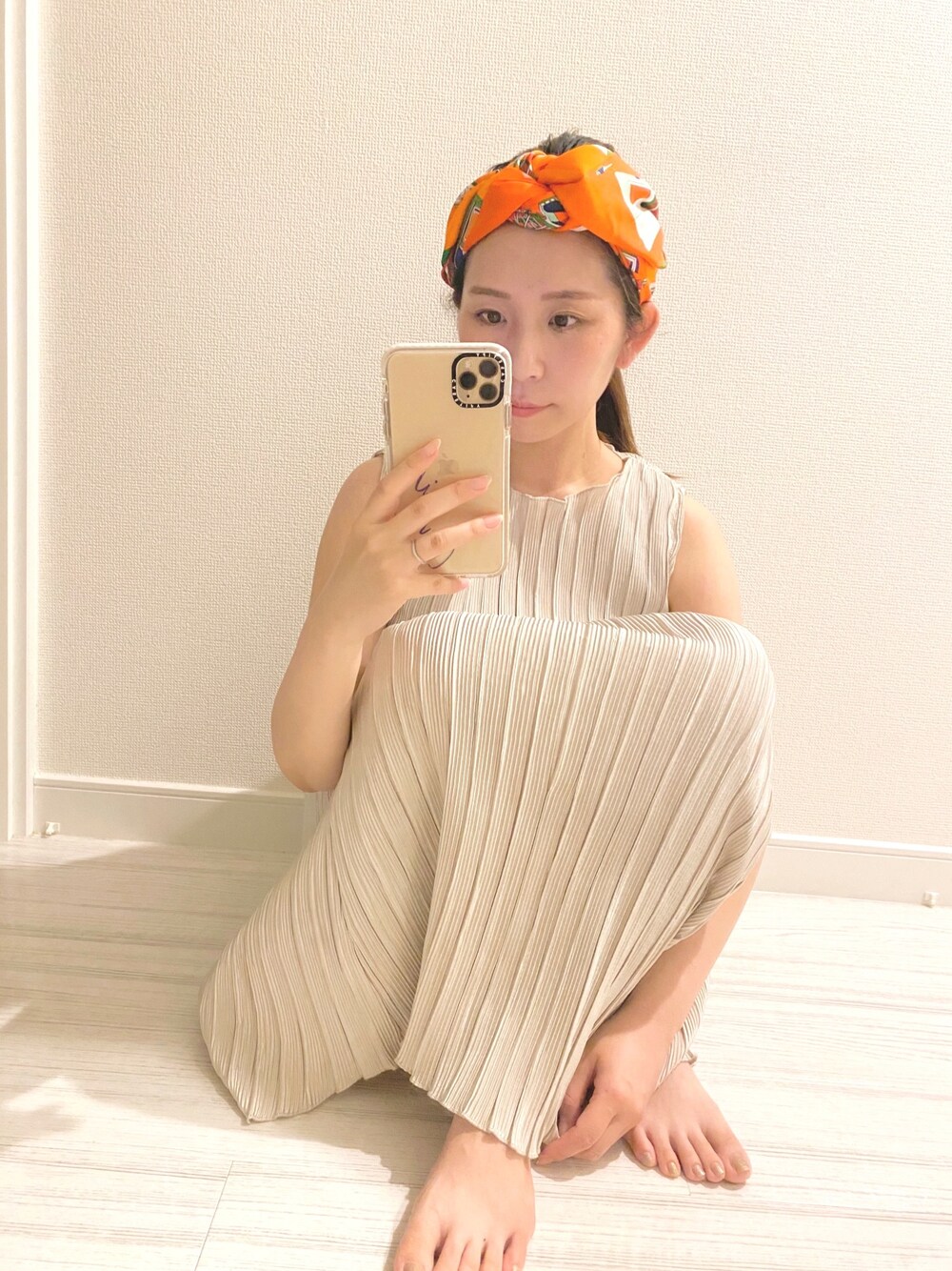 プリーツワンピース×ストールアレンジ シンプルなワンピースコーデの日は、ストールをプラスワン🍊