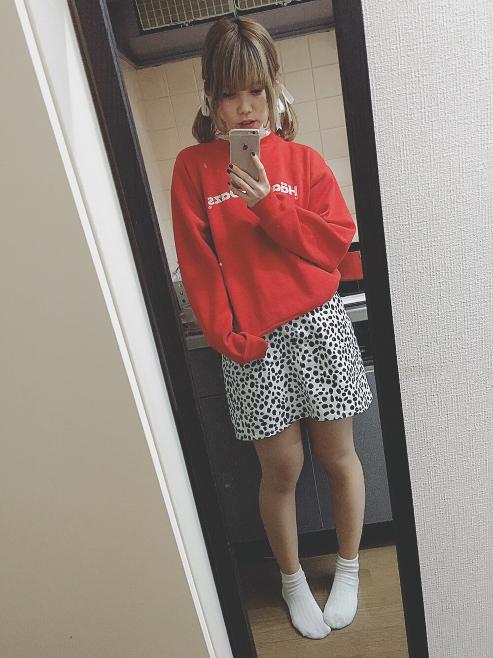 大好きなハーゲンダッツのスウェットを使ったコーディネート👻👻👻 ダルメシアン柄と赤って最強の組み合わせだと思う🐶❤️ダルメシアン柄、意外となにに合わせても可愛くなるのですごくおすすめです! そのままだとカジュアルなのを、レースのインナーと、白いリボンで可愛いのに寄せてます✌︎('ω')✌︎ よければ、いいね♡フォローおねがいします〜(^_^)☆