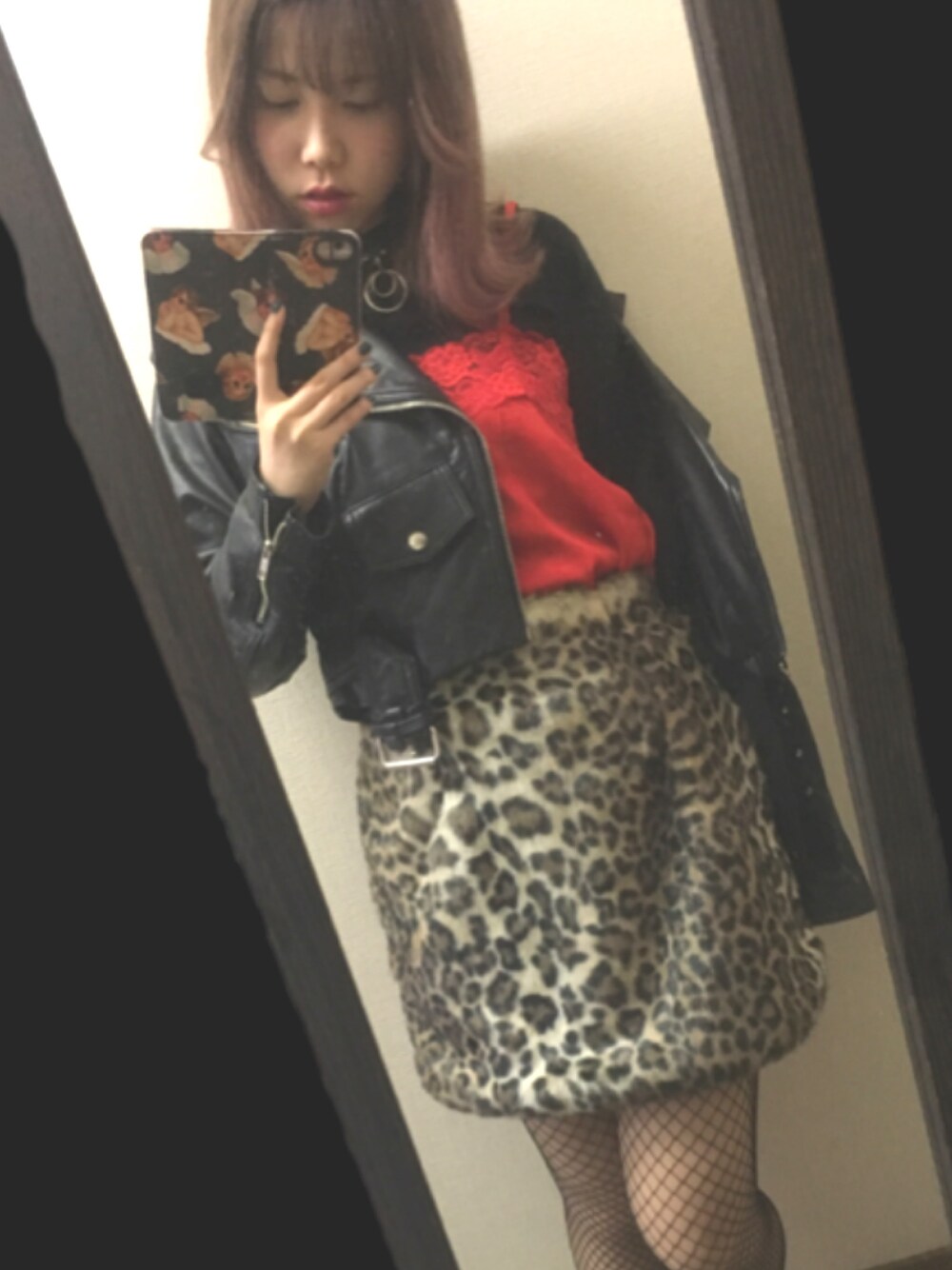 普段あんましないロックテイスト チョーカー、レザー、ヒョウ柄で強め そこに赤いキャミ、 スカートのふわふわで女の子らしさも ぷら〜す! 季節感ちょっとずれててごめんなさい🤤