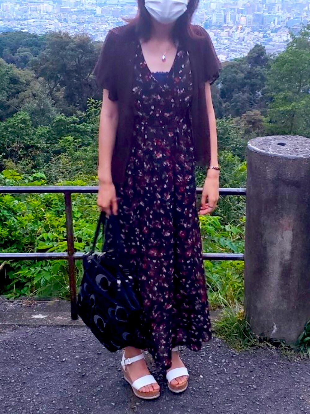 EMODAのワンピース。 168cmに5cmくらいの厚底サンダルでこの丈感だから、なかなかのロング。 EMODAは細くて丈が長いからボトムスは好みなのが多い👖♥️ ポージングの慣れてない感がすごい。笑