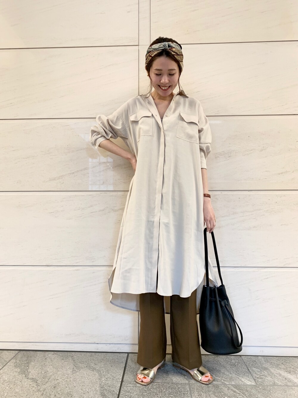 着回しバツグンのシャツワンピース、 アースカラーでまとめて大人っぽく。