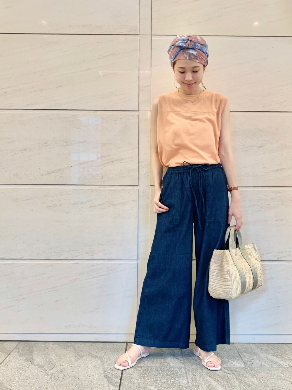 スカーフ使いで、シンプルコーデも華やかに。